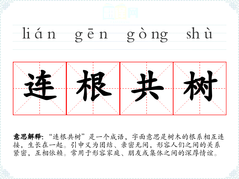 - 文学作品:在诗歌或散文中,用于描写亲情、友情的深厚,如“在风雨飘摇的日子里,正是我们连根共树,才能抵御外界的侵扰。”
