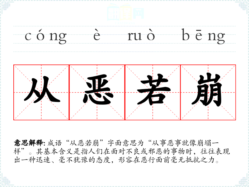 成语“从恶若崩”字面意思为“从事恶事就像崩塌一样”。其基本含义是指人们在面对不良或邪恶的事物时,往往表现出一种迅速、毫不犹豫的态度,形容在恶行面前毫无抵抗之力。