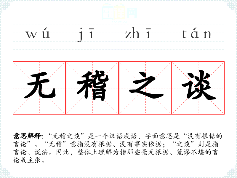“无稽之谈”是一个汉语成语,字面意思是“没有根据的言论”。“无稽”意指没有根据、没有事实依据;“之谈”则是指言论、说法。因此,整体上理解为指那些毫无根据、荒谬不堪的言论或主张。