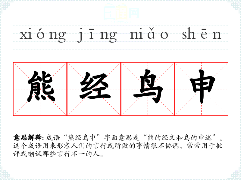 成语“熊经鸟申”字面意思是“熊的经文和鸟的申述”。这个成语用来形容人们的言行或所做的事情很不协调,常常用于批评或嘲讽那些言行不一的人。
