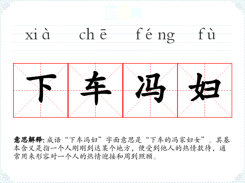 成语“下车冯妇”字面意思是“下车的冯家妇女”。其基本含义是指一个人刚刚到达某个地方,便受到他人的热情款待,通常用来形容对一个人的热情迎接和周到照顾。