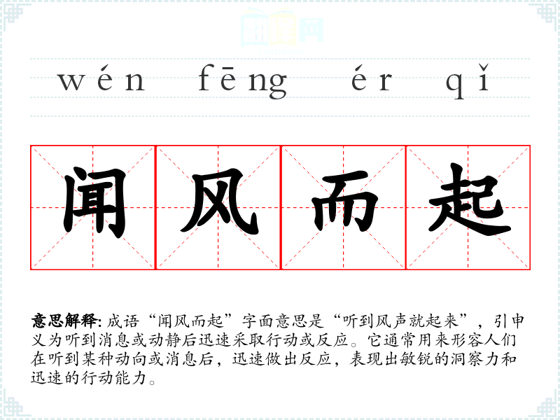 成语“闻风而起”字面意思是“听到风声就起来”,引申义为听到消息或动静后迅速采取行动或反应。它通常用来形容人们在听到某种动向或消息后,迅速做出反应,表现出敏锐的洞察力和迅速的行动能力。
