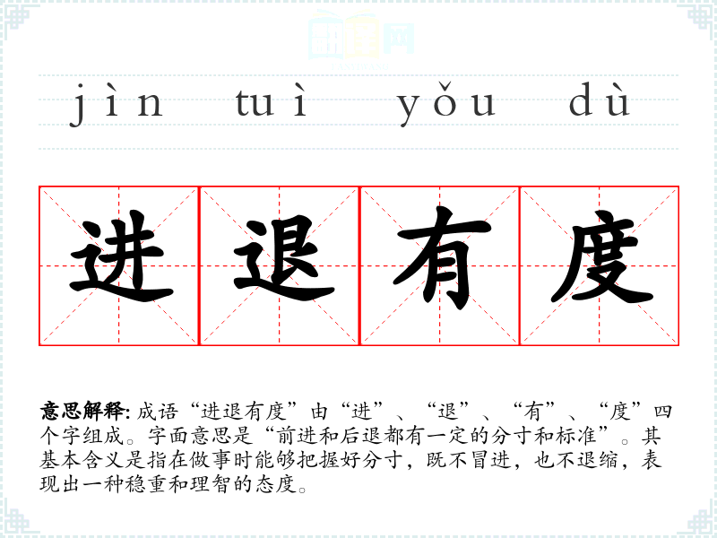 成语“进退有度”由“进”、“退”、“有”、“度”四个字组成。字面意思是“前进和后退都有一定的分寸和标准”。其基本含义是指在做事时能够把握好分寸,既不冒进,也不退缩,表现出一种稳重和理智的态度。