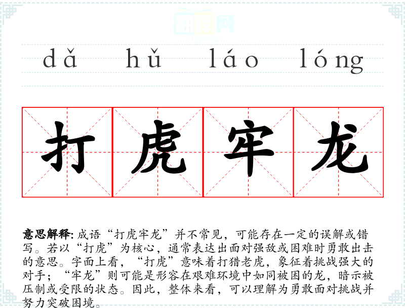 成语“打虎牢龙”并不常见,可能存在一定的误解或错写。若以“打虎”为核心,通常表达出面对强敌或困难时勇敢出击的意思。字面上看,“打虎”意味着打猎**,象征着挑战强大的对手;“牢龙”则可能是形容在艰难环境中如同被困的龙,暗示被压制或受限的状态。因此,整体来看,可以理解为勇敢面对挑战并努力突破困境。