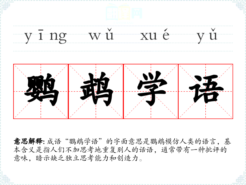 成语“鹦鹉学语”的字面意思是鹦鹉模仿人类的语言,基本含义是指人们不加思考地重复别人的话语,通常带有一种批评的意味,暗示缺乏独立思考能力和创造力。