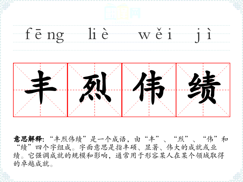 “丰烈伟绩”是一个成语,由“丰”、“烈”、“伟”和“绩”四个字组成。字面意思是指丰硕、显著、伟大的成就或业绩。它强调成就的规模和影响,通常用于形容某人在某个领域取得的卓越成就。