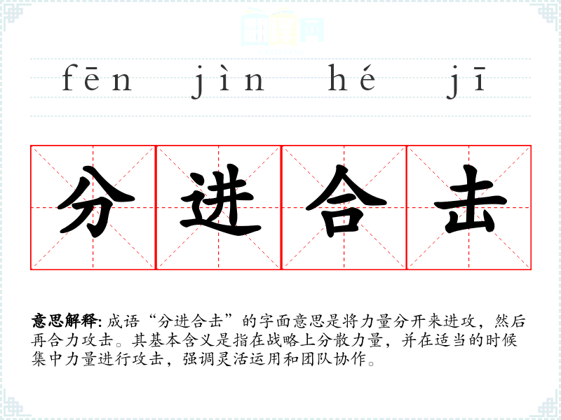 “分进合击”源于军事战术,通常用于描述在战斗中如何灵活运用部队。虽然没有明确的历史典故,但其概念在古代兵法中屡见不鲜,尤其在《孙子兵法》中强调了“分而治之”的原则,反映了古代军事智慧。
