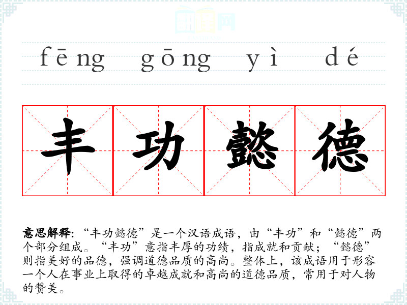 “丰功懿德”是一个汉语成语,由“丰功”和“懿德”两个部分组成。“丰功”意指丰厚的功绩,指成就和贡献;“懿德”则指美好的品德,强调道德品质的高尚。整体上,该成语用于形容一个人在事业上取得的卓越成就和高尚的道德品质,常用于对人物的赞美。