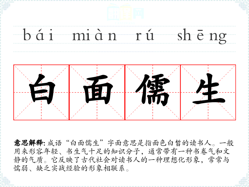 成语“白面儒生”字面意思是指面色白皙的读书人。一般用来形容年轻、书生气十足的知识分子,通常带有一种书卷气和文静的气质。它反映了古代社会对读书人的一种理想化形象,常常与懦弱、缺乏实战经验的形象相联系。