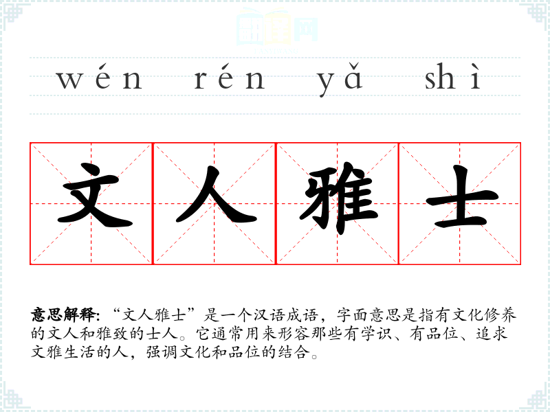 “文人雅士”是一个汉语成语,字面意思是指有文化修养的文人和雅致的士人。它通常用来形容那些有学识、有品位、追求文雅生活的人,强调文化和品位的结合。
