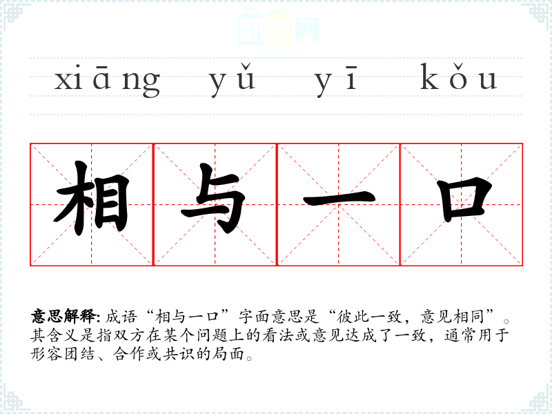 成语“相与一口”字面意思是“彼此一致,意见相同”。其含义是指双方在某个问题上的看法或意见达成了一致,通常用于形容团结、合作或共识的局面。