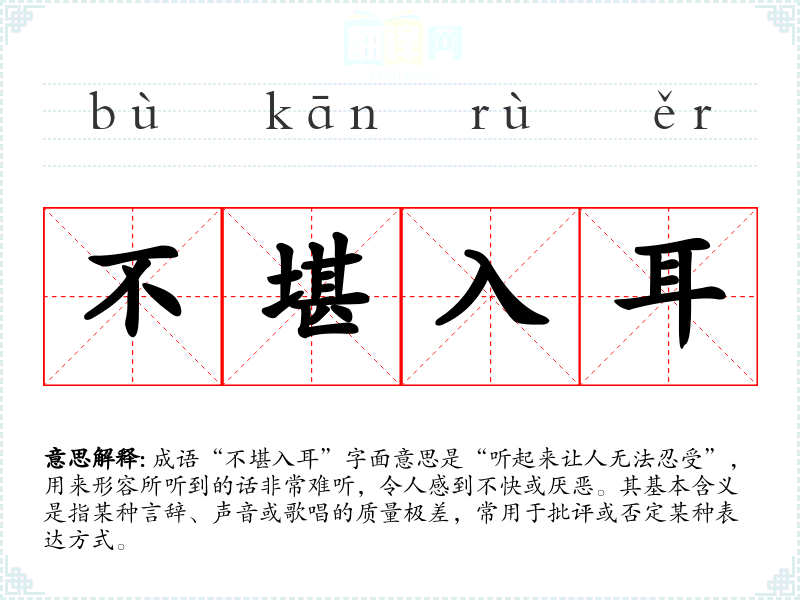 成语“不堪入耳”字面意思是“听起来让人无法忍受”,用来形容所听到的话非常难听,令人感到不快或厌恶。其基本含义是指某种言辞、声音或歌唱的质量极差,常用于批评或否定某种表达方式。