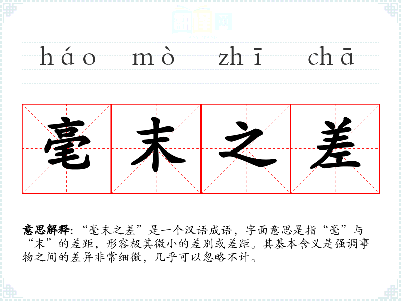 “毫末之差”最早出现在古代典籍中,具体的历史背景不详,但该成语的构成部分“毫”和“末”在古文中常用来形容极小的事物。“毫”指的是极细的毛发或丝,形容微小;“末”则是指事物的末端或微小部分。因此,成语的形成与古人对事物细微差别的观察和描述密切相关。