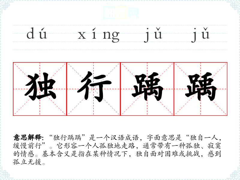 “独行踽踽”是一个汉语成语,字面意思是“独自一人,缓慢前行”。它形容一个人孤独地走路,通常带有一种孤独、寂寞的情感。基本含义是指在某种情况下,独自面对困难或挑战,感到孤立无援。