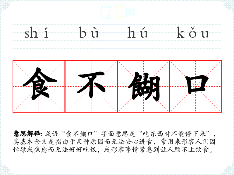 成语“食不餬口”字面意思是“吃东西时不能停下来”,其基本含义是指由于某种原因而无法安心进食,常用来形容人们因忙碌或焦虑而无法好好吃饭,或形容事情紧急到让人顾不上饮食。