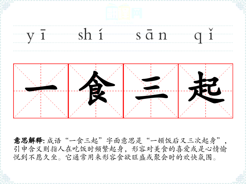 成语“一食三起”字面意思是“一顿饭后又三次起身”,引申含义则指人在吃饭时频繁起身,形容对美食的喜爱或是心情愉悦到不愿久坐。它通常用来形容食欲旺盛或聚会时的欢快氛围。