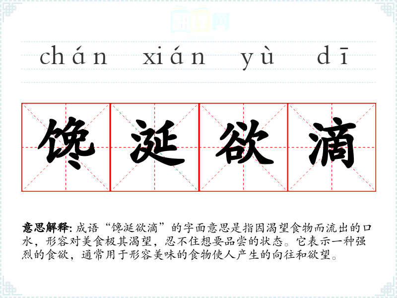 成语“馋涎欲滴”的字面意思是指因渴望食物而流出的口水,形容对美食极其渴望,忍不住想要品尝的状态。它表示一种强烈的食欲,通常用于形容美味的食物使人产生的向往和欲望。