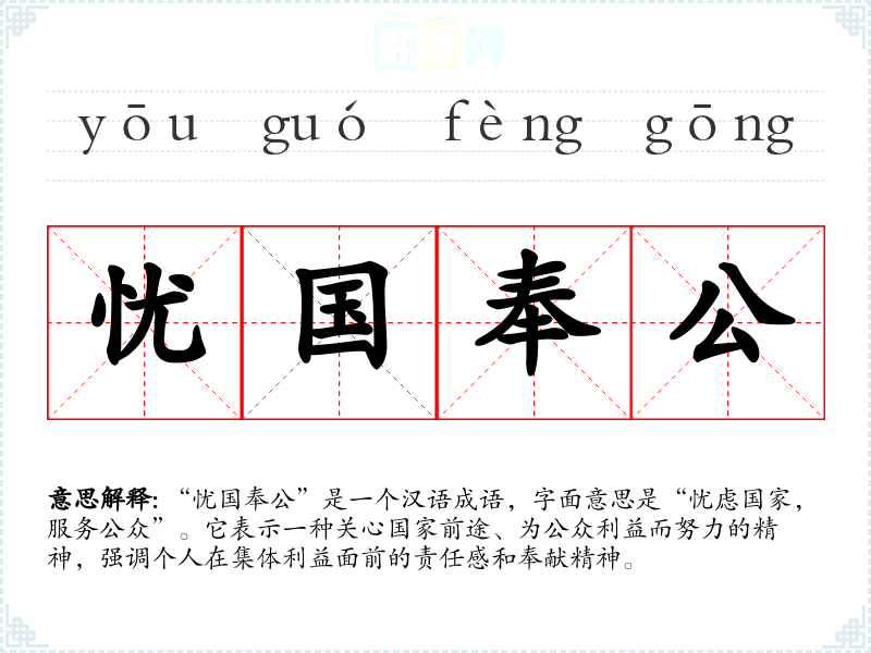 “忧国奉公”是一个汉语成语,字面意思是“忧虑国家,服务公众”。它表示一种关心国家前途、为公众利益而努力的精神,强调个人在集体利益面前的责任感和奉献精神。