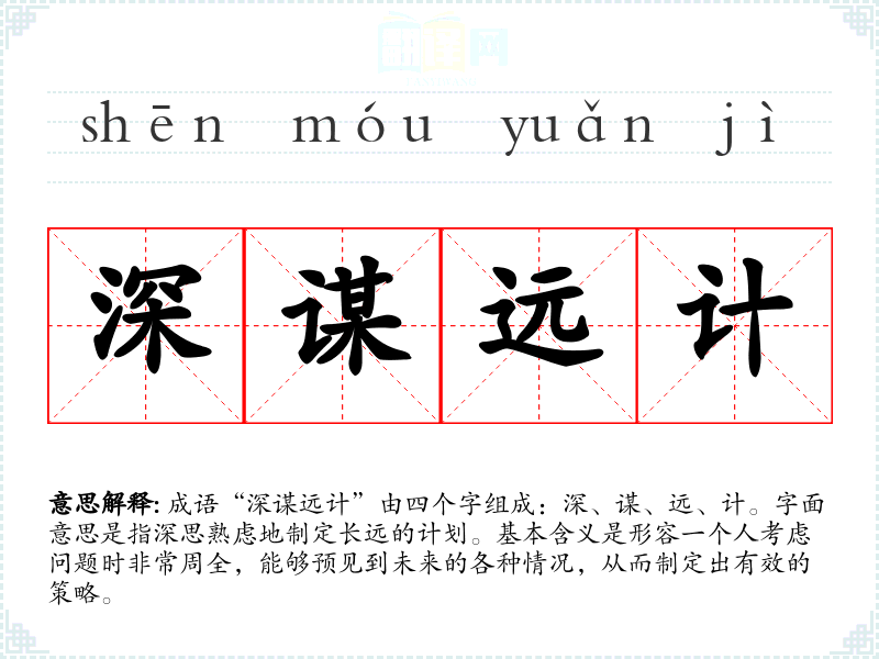 在**传统文化中,深谋远计体现了儒家思想中的智慧与谨慎,强调预见性和战略思维的重要性。在现代社会中,这一成语的适用性依然广泛,特别是在商业和政治决策中,深谋远计被视为成功的重要因素。