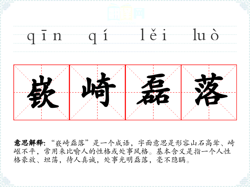 “嵚崎磊落”是一个成语,字面意思是形容山石高耸、崎岖不平,常用来比喻人的性格或处事风格。基本含义是指一个人性格豪放、坦荡,待人真诚,处事光明磊落,毫不隐瞒。