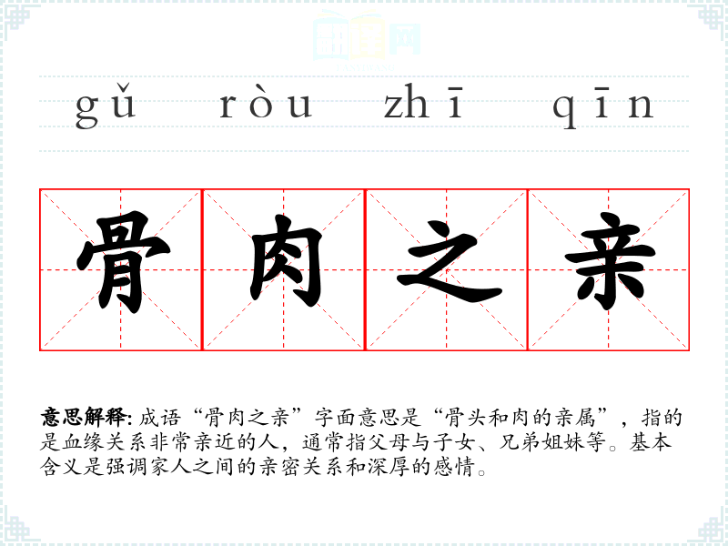成语“骨肉之亲”字面意思是“骨头和肉的亲属”,指的是血缘关系非常亲近的人,通常指父母与子女、兄弟姐妹等。基本含义是强调家人之间的亲密关系和深厚的感情。