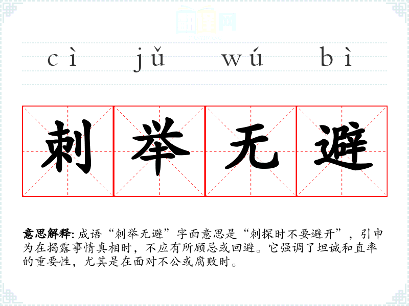 成语“刺举无避”字面意思是“刺探时不要避开”,引申为在揭露事情真相时,不应有所顾忌或回避。它强调了坦诚和直率的重要性,尤其是在面对不公或腐败时。