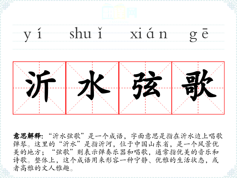 “沂水弦歌”是一个成语,字面意思是指在沂水边上唱歌弹琴。这里的“沂水”是指沂河,位于**山东省,是一个风景优美的地方;“弦歌”则表示弹奏乐器和唱歌,通常指优美的音乐和诗歌。整体上,这个成语用来形容一种宁静、优雅的生活状态,或者高雅的文人雅趣。