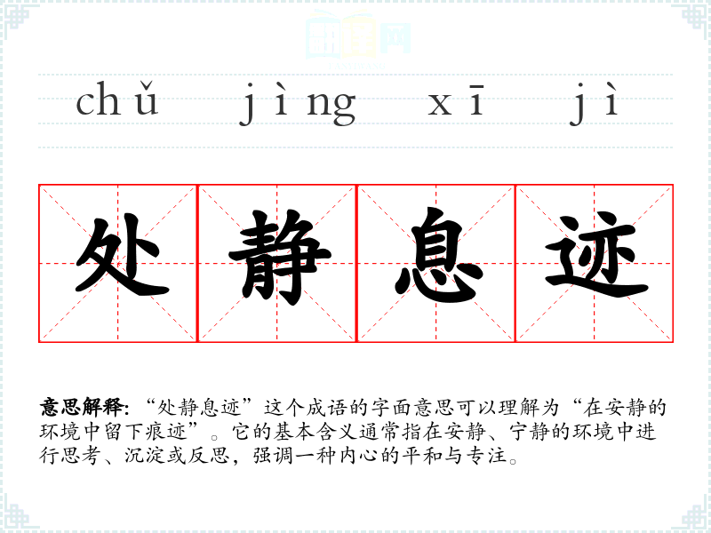 “处静息迹”这个成语的字面意思可以理解为“在安静的环境中留下痕迹”。它的基本含义通常指在安静、宁静的环境中进行思考、沉淀或反思,强调一种内心的平和与专注。
