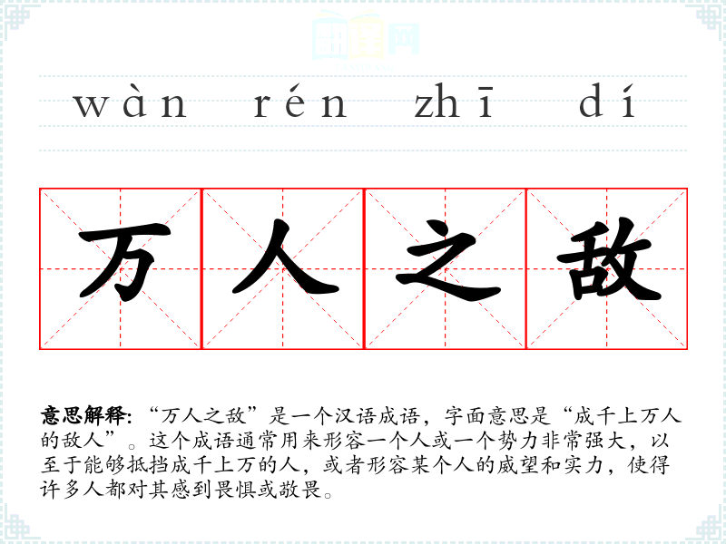 “万人之敌”是一个汉语成语,字面意思是“成千上万人的敌人”。这个成语通常用来形容一个人或一个势力非常强大,以至于能够抵挡成千上万的人,或者形容某个人的威望和实力,使得许多人都对其感到畏惧或敬畏。