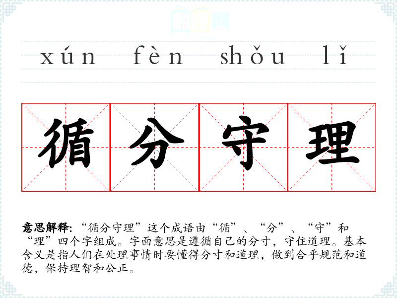 “循分守理”这个成语由“循”、“分”、“守”和“理”四个字组成。字面意思是遵循自己的分寸,守住道理。基本含义是指人们在处理事情时要懂得分寸和道理,做到合乎规范和道德,保持理智和公正。
