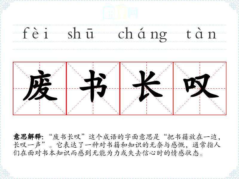 “废书长叹”这个成语的字面意思是“把书籍放在一边,长叹一声”。它表达了一种对书籍和知识的无奈与感慨,通常指人们在面对书本知识而感到无能为力或失去信心时的情感状态。
