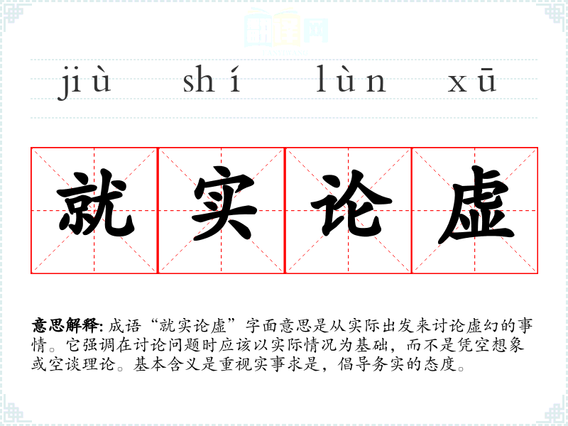 - 实事求是:强调根据实际情况行事,类似于“就实论虚”。