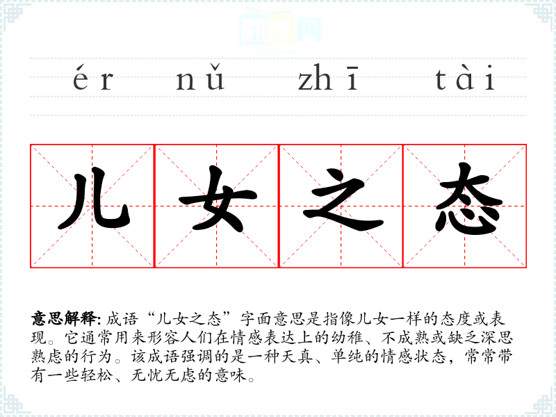 成语“儿女之态”字面意思是指像儿女一样的态度或表现。它通常用来形容人们在情感表达上的幼稚、不成熟或缺乏深思熟虑的行为。该成语强调的是一种天真、单纯的情感状态,常常带有一些轻松、无忧无虑的意味。