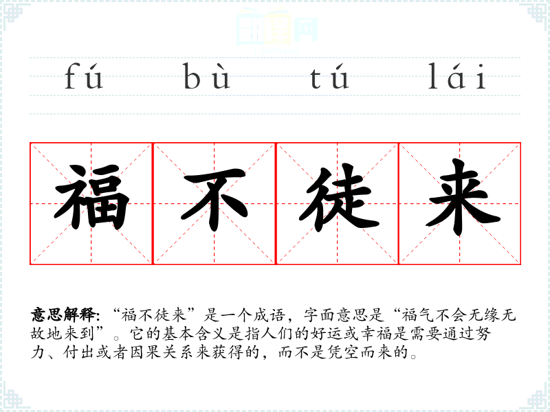 “福不徒来”是一个成语,字面意思是“福气不会无缘无故地来到”。它的基本含义是指人们的好运或幸福是需要通过努力、付出或者因果关系来获得的,而不是凭空而来的。