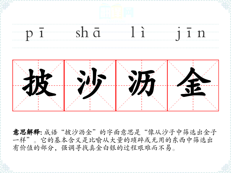 成语“披沙沥金”的字面意思是“像从沙子中筛选出金子一样”。它的基本含义是比喻从大量的琐碎或无用的东西中筛选出有价值的部分,强调寻找真金白银的过程艰难而不易。