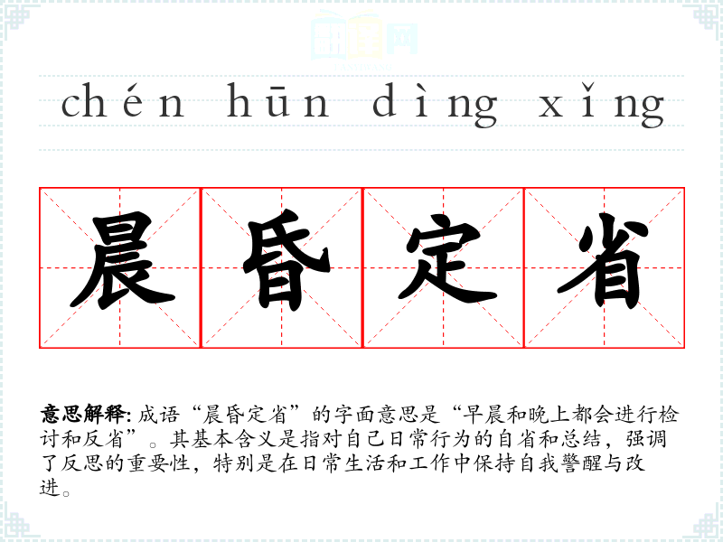 成语“晨昏定省”的字面意思是“早晨和晚上都会进行检讨和反省”。其基本含义是指对自己日常行为的自省和总结,强调了反思的重要性,特别是在日常生活和工作中保持自我警醒与改进。
