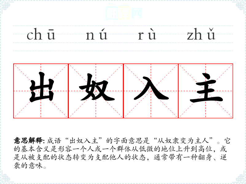 成语“出奴入主”的字面意思是“从奴隶变为主人”。它的基本含义是形容一个人或一个群体从低微的地位上升到高位,或是从被支配的状态转变为支配他人的状态,通常带有一种翻身、逆袭的意味。