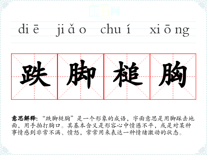 “跌脚槌胸”是一个形象的成语,字面意思是用脚踩击地面,用手拍打胸口。其基本含义是形容心中愤懑不平,或是对某种事情感到非常不满、愤怒,常常用来表达一种情绪激动的状态。