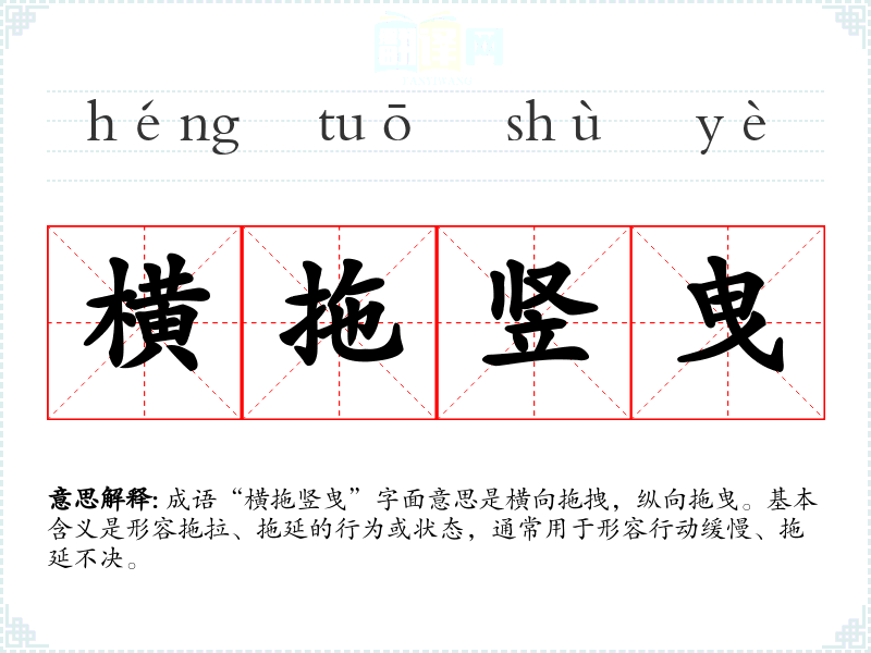 成语“横拖竖曳”字面意思是横向拖拽,纵向拖曳。基本含义是形容拖拉、拖延的行为或状态,通常用于形容行动缓慢、拖延不决。