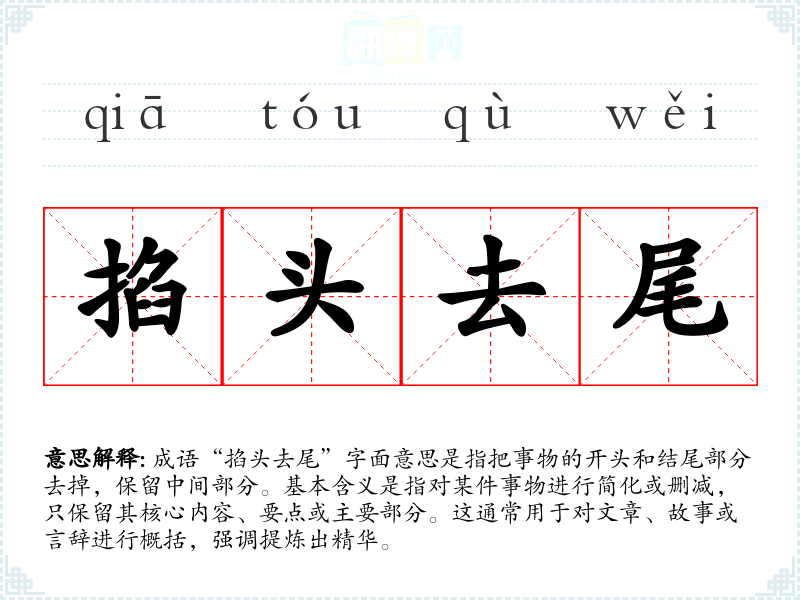 “掐头去尾”并没有明确的历史出处,属于较为口语化的成语,可能源于民间的俗语。其构成的字面意象很形象,传达了对内容进行精简的过程。虽然没有特定的文献记录,但其使用频率和接受度表明其在语言中的普遍性。