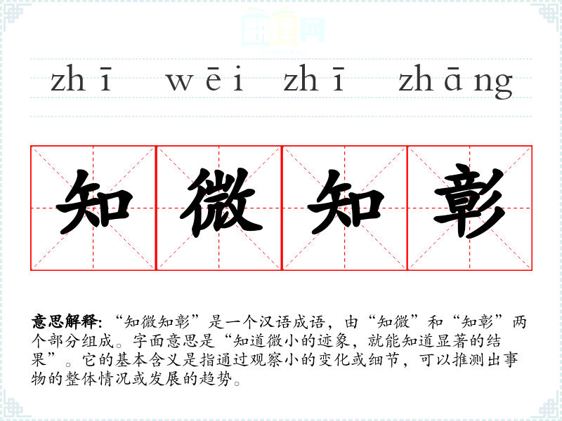 “知微知彰”是一个汉语成语,由“知微”和“知彰”两个部分组成。字面意思是“知道微小的迹象,就能知道显著的结果”。它的基本含义是指通过观察小的变化或细节,可以推测出事物的整体情况或发展的趋势。