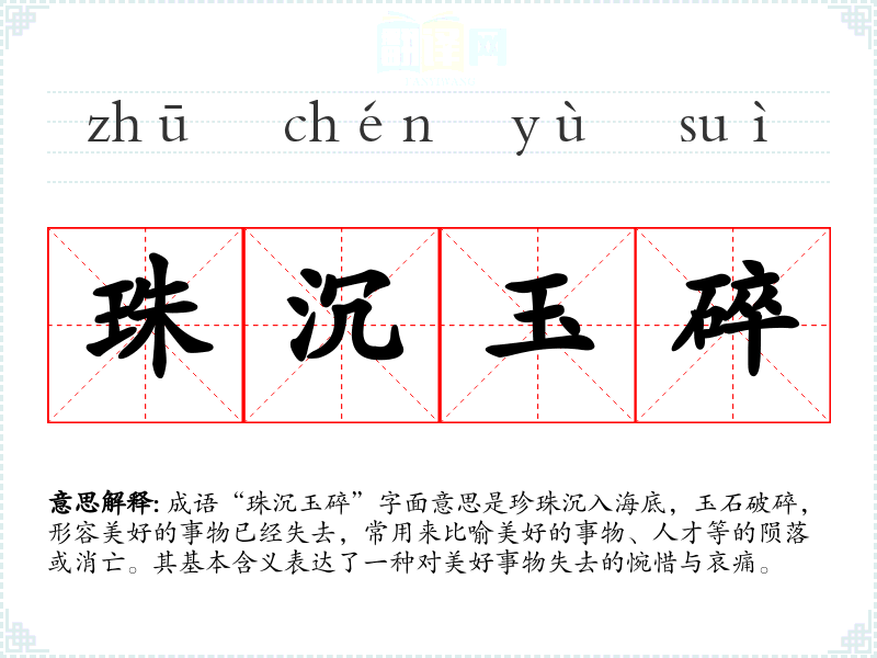 成语“珠沉玉碎”字面意思是珍珠沉入海底,玉石破碎,形容美好的事物已经失去,常用来比喻美好的事物、人才等的陨落或消亡。其基本含义表达了一种对美好事物失去的惋惜与哀痛。
