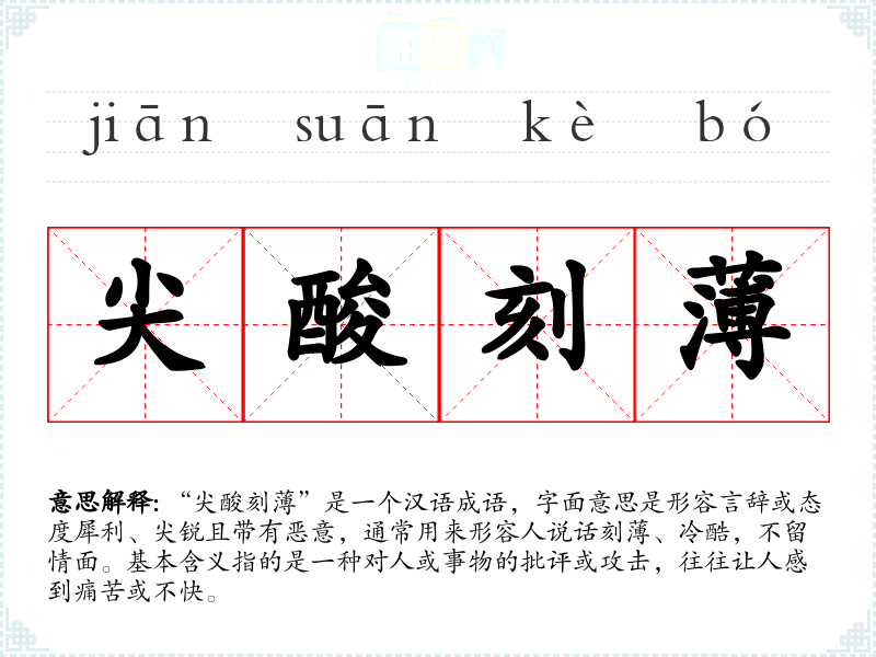 “尖酸刻”是一个汉语成语,字面意思是形容言辞或态度犀利、尖锐且带有恶意,通常用来形容人说话刻、冷酷,不留情面。基本含义指的是一种对人或事物的批评或攻击,往往让人感到痛苦或不快。