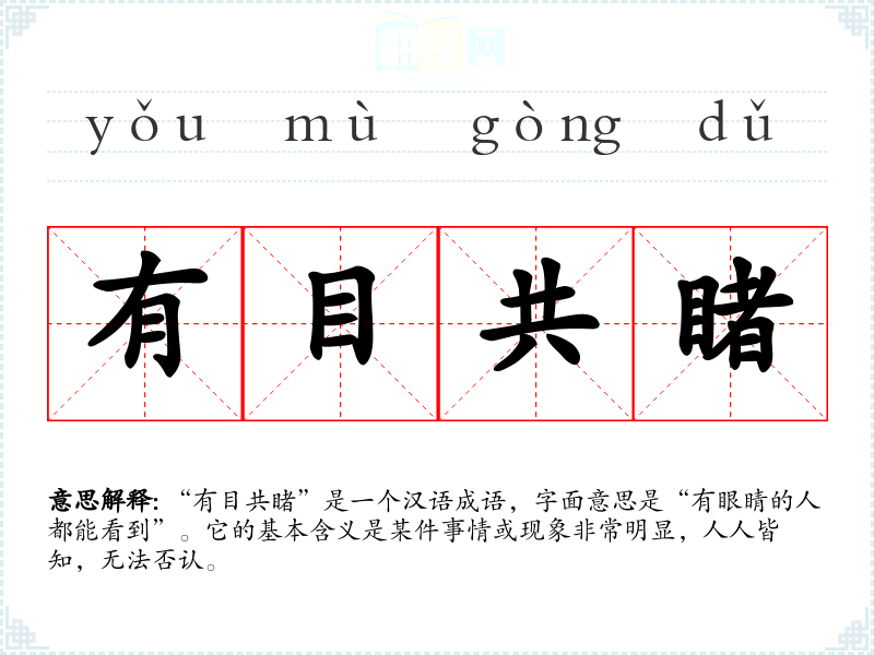 “有目共睹”是一个汉语成语,字面意思是“有眼睛的人都能看到”。它的基本含义是某件事情或现象非常明显,人人皆知,无法否认。