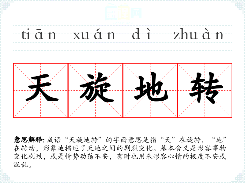 “天旋地转”源自古代文化,尤其是古代哲学和天文学的观念。在古代,天被视为圆形,地为方形,天旋地转的概念常用于描述宇宙的变化与。具体的文学出处较为模糊,但它常常被用在古诗词中,描绘自然界的变化和人心的动荡。