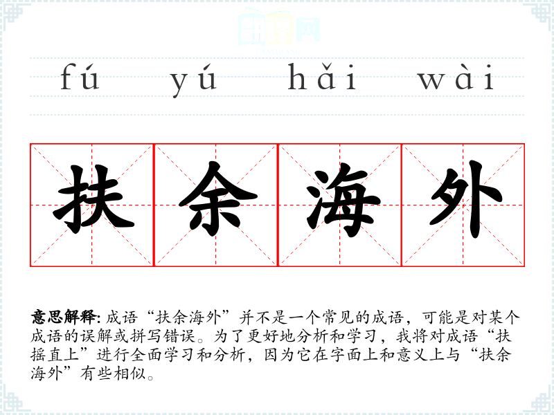 成语“扶余海外”并不是一个常见的成语,可能是对某个成语的误解或拼写错误。为了更好地分析和学习,我将对成语“扶摇直上”进行全面学习和分析,因为它在字面上和意义上与“扶余海外”有些相似。