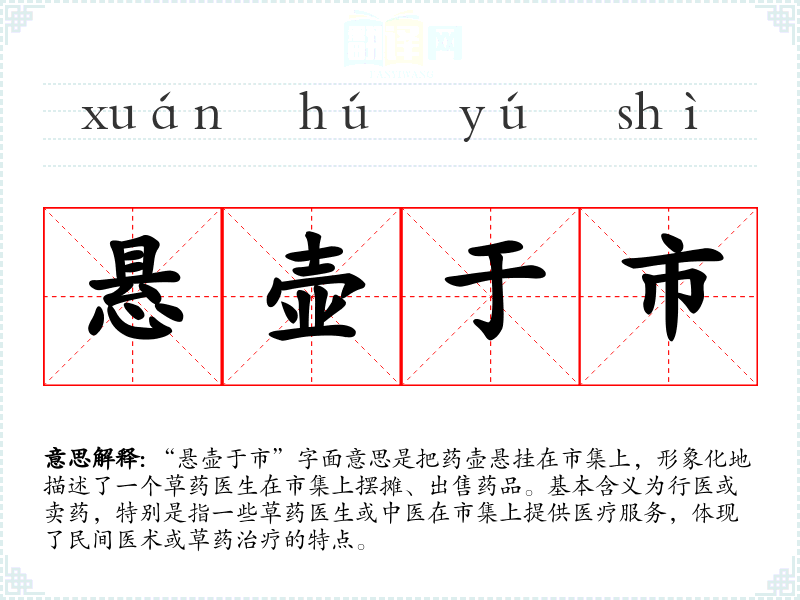 “悬壶于市”字面意思是把药壶悬挂在市集上,形象化地描述了一个草药医生在市集上摆摊、出售药品。基本含义为行医或卖药,特别是指一些草药医生或中医在市集上提供医疗服务,体现了民间医术或草药治疗的特点。