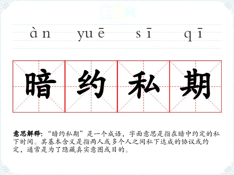 “暗约私期”是一个成语,字面意思是指在暗中约定的私下时间。其基本含义是指两人或多个人之间私下达成的协议或约定,通常是为了隐藏真实意图或目的。