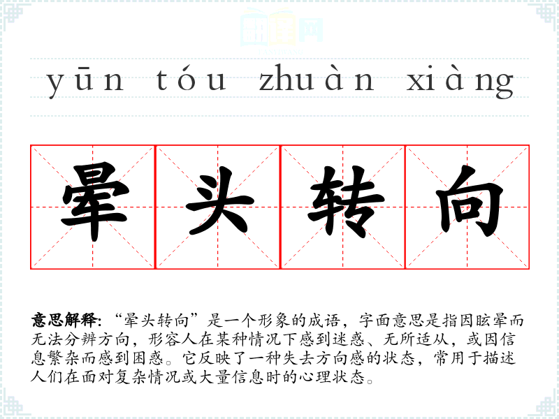 “晕头转向”是一个形象的成语,字面意思是指因眩晕而无法分辨方向,形容人在某种情况下感到迷惑、无所适从,或因信息繁杂而感到困惑。它反映了一种失去方向感的状态,常用于描述人们在面对复杂情况或大量信息时的心理状态。