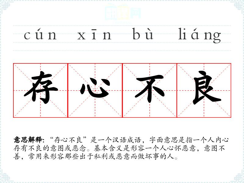“存心不良”是一个汉语成语,字面意思是指一个人内心存有不良的意图或恶念。基本含义是形容一个人心怀恶意,意图不善,常用来形容那些出于私利或恶意而做坏事的人。